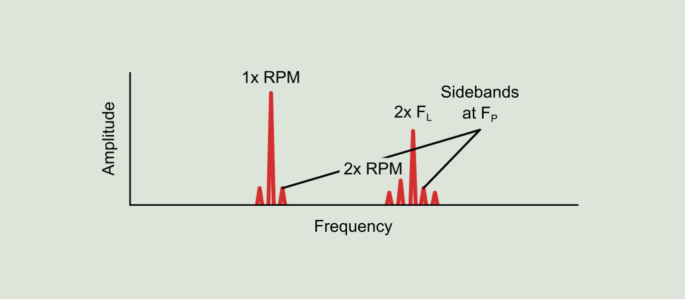 Eccentric rotors produce a rotating variable air gap between the rotor and the stator inducing a pulsating vibration, usually located between 2x FL and the nearest operating operating speed harmonic. Frequently it is necessary to "zoom in" the spectrum to separate 2x FL from the operating speed harmonic. Eccentric rotors produce 2x FL vibration surrounded by the side bands of the pole pass frequency (FP) as well as FP side bands around the operating speed. FP appears at low frequency since common FP values range from approximately 20 to 120 CPM (0.3 ~ 2.0 Hz).